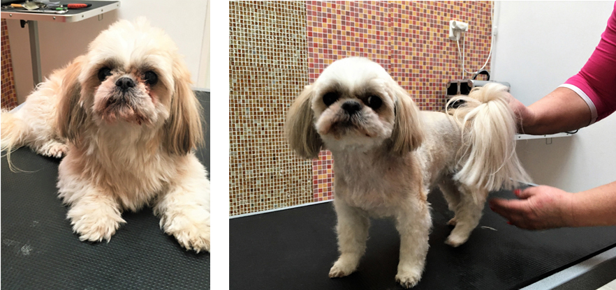 Stříhání pejska plemene Shih-Tzu před ostříháním a po ostříhání.